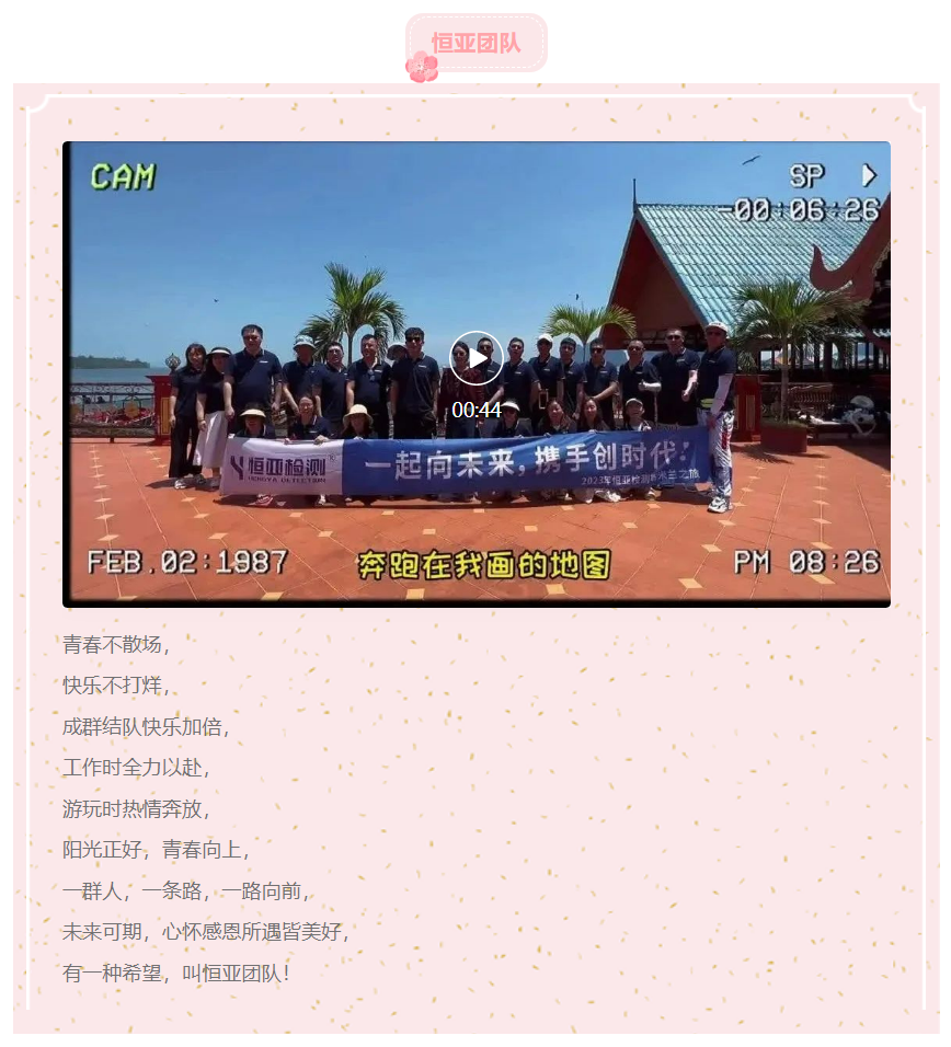 青春不散場(chǎng), 快樂(lè)不打烊, 成群結(jié)隊(duì)快樂(lè)加倍, 工作時(shí)全力以赴, 游玩時(shí)熱情奔放, 陽(yáng)光正好,青春向上, 一群人,一條路,一路向前, 未來(lái)可期,心懷感恩所遇皆美好, 有一種希望,叫恒亞團(tuán)隊(duì)!